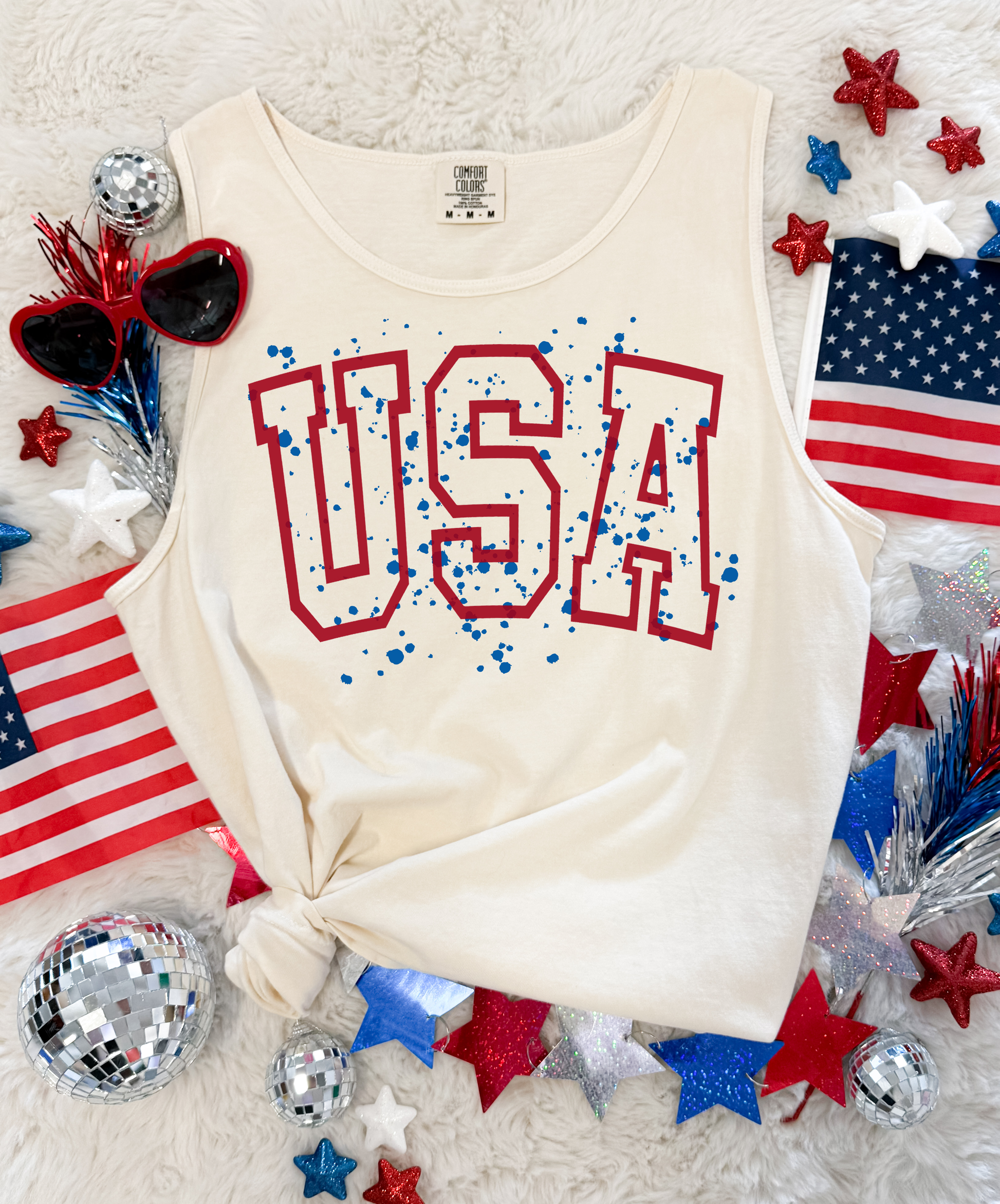 Cream Comfort Color Tank- Red Outline USA and Blue splatter