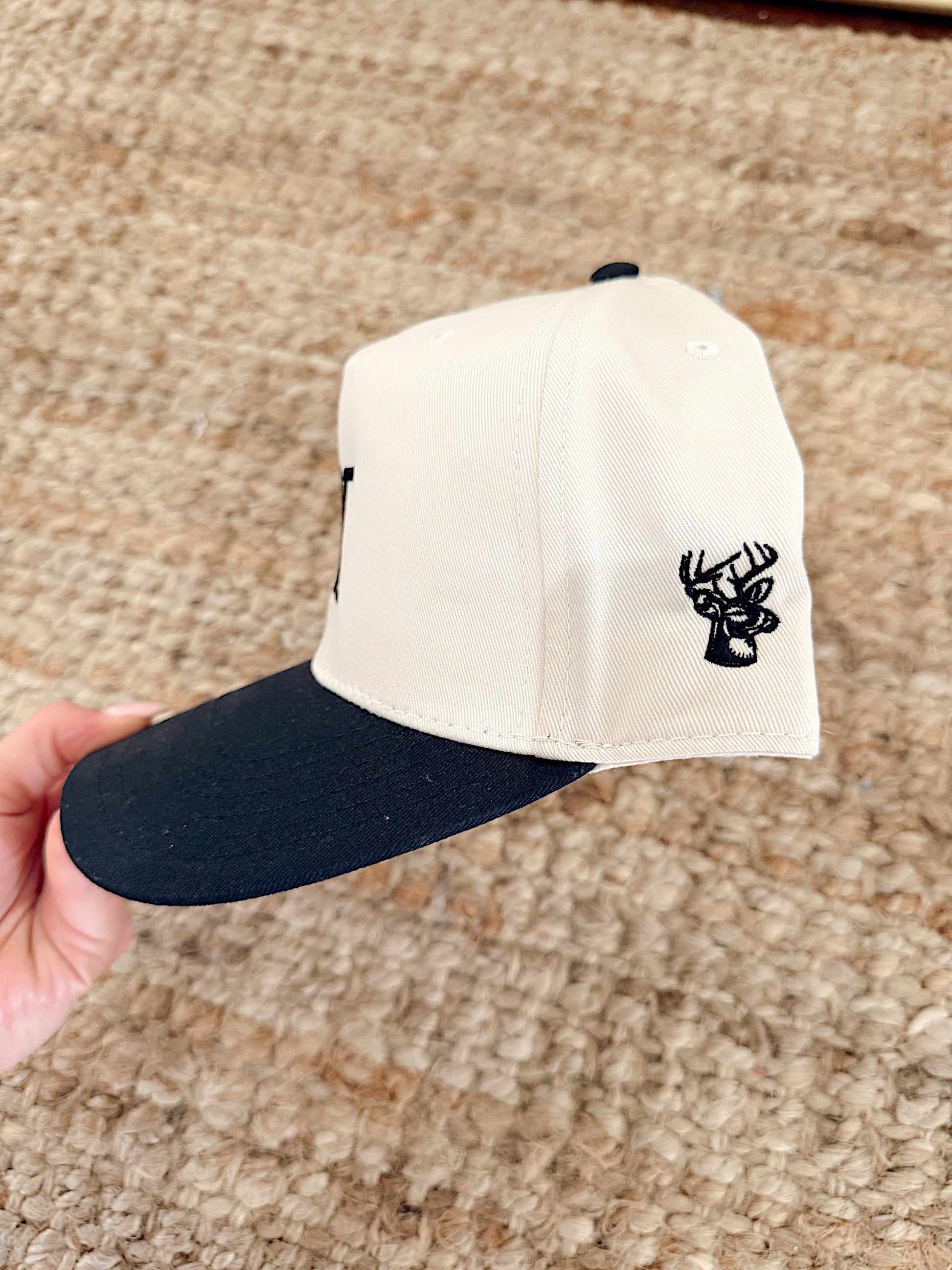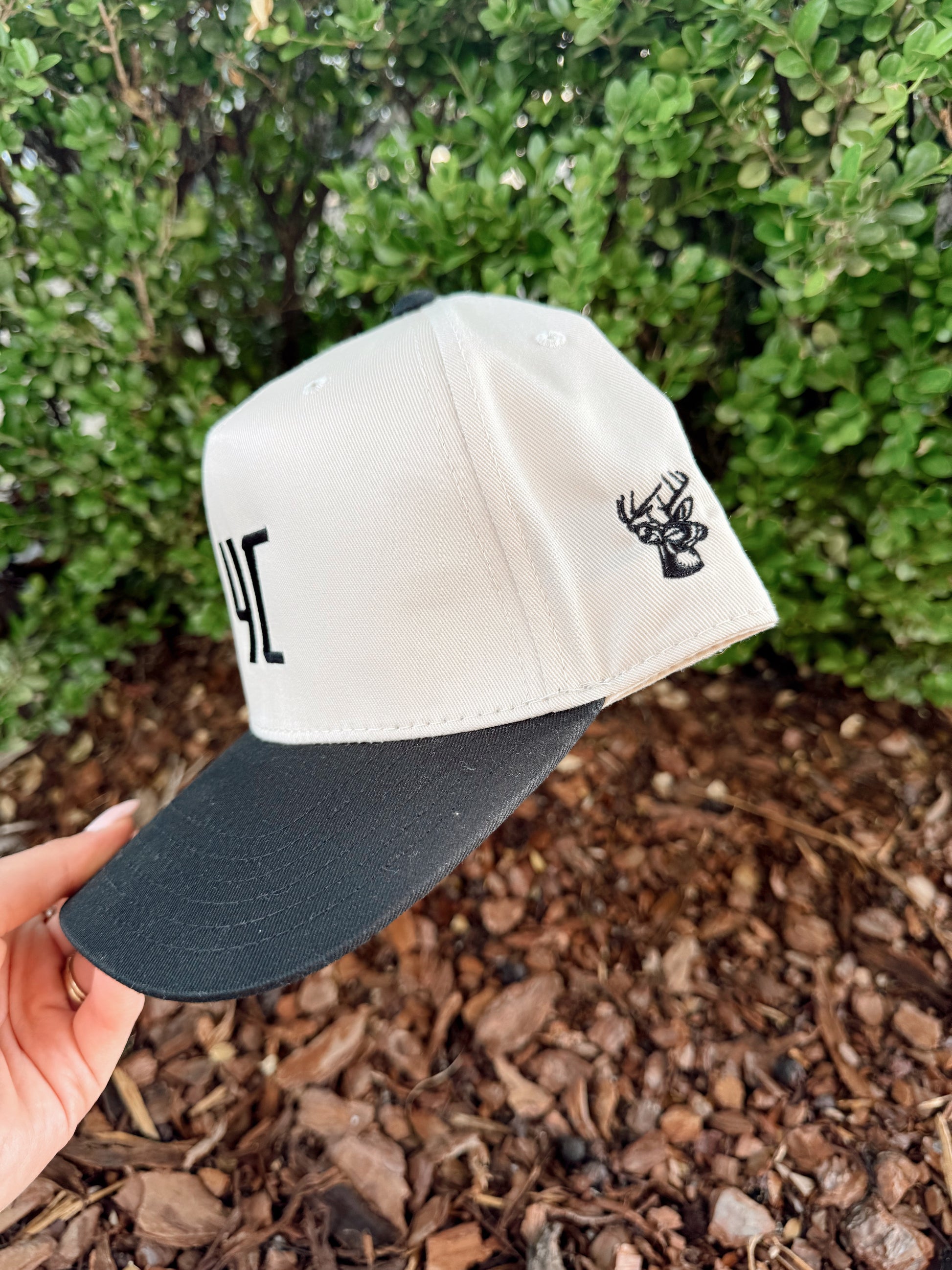 Otto Beige hat with black detail and black 4C Embroidery on the front with deer head embroidery on the side.