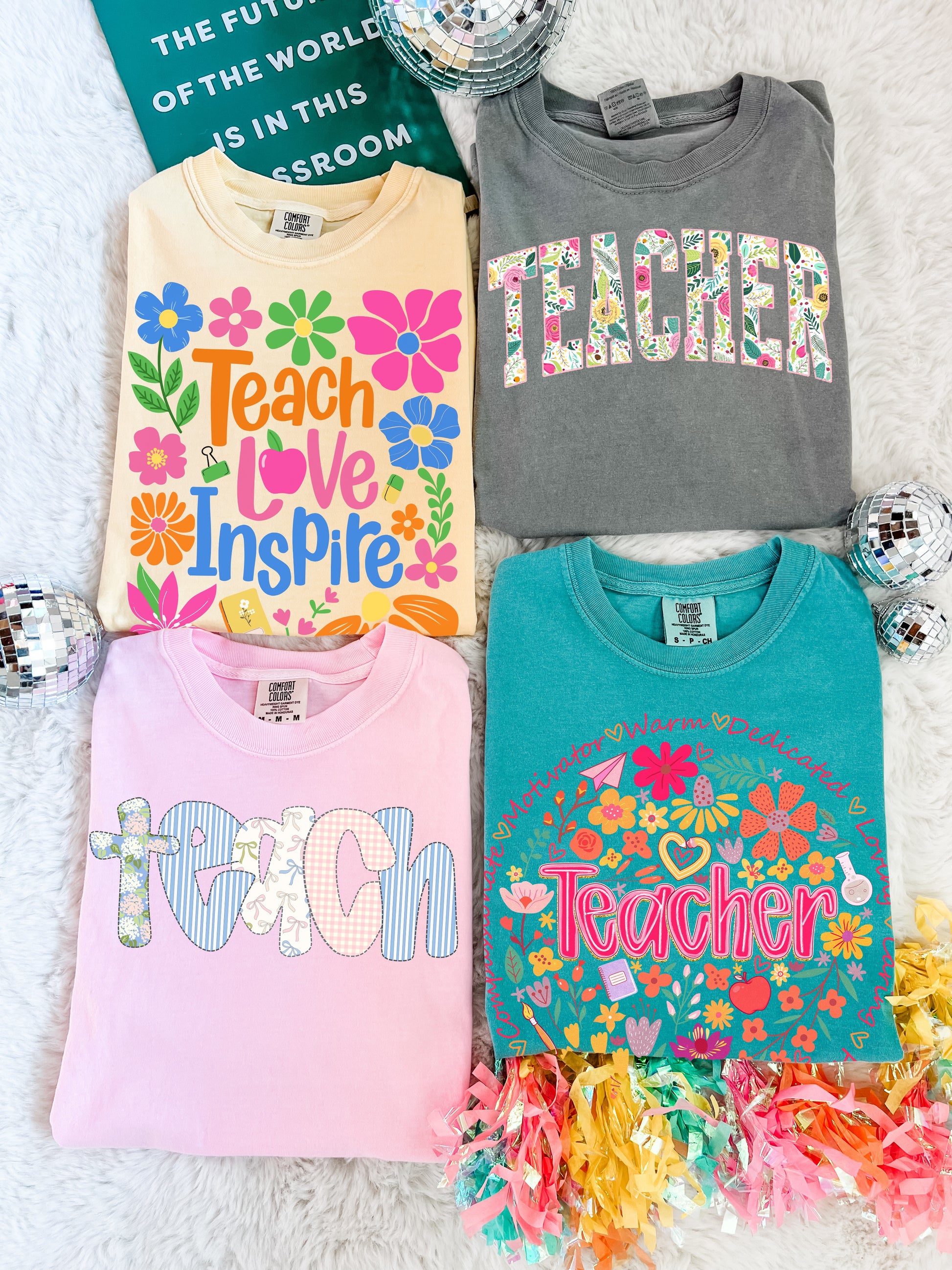 Teacher with Flowers- Seafoam Comfort Color Tee