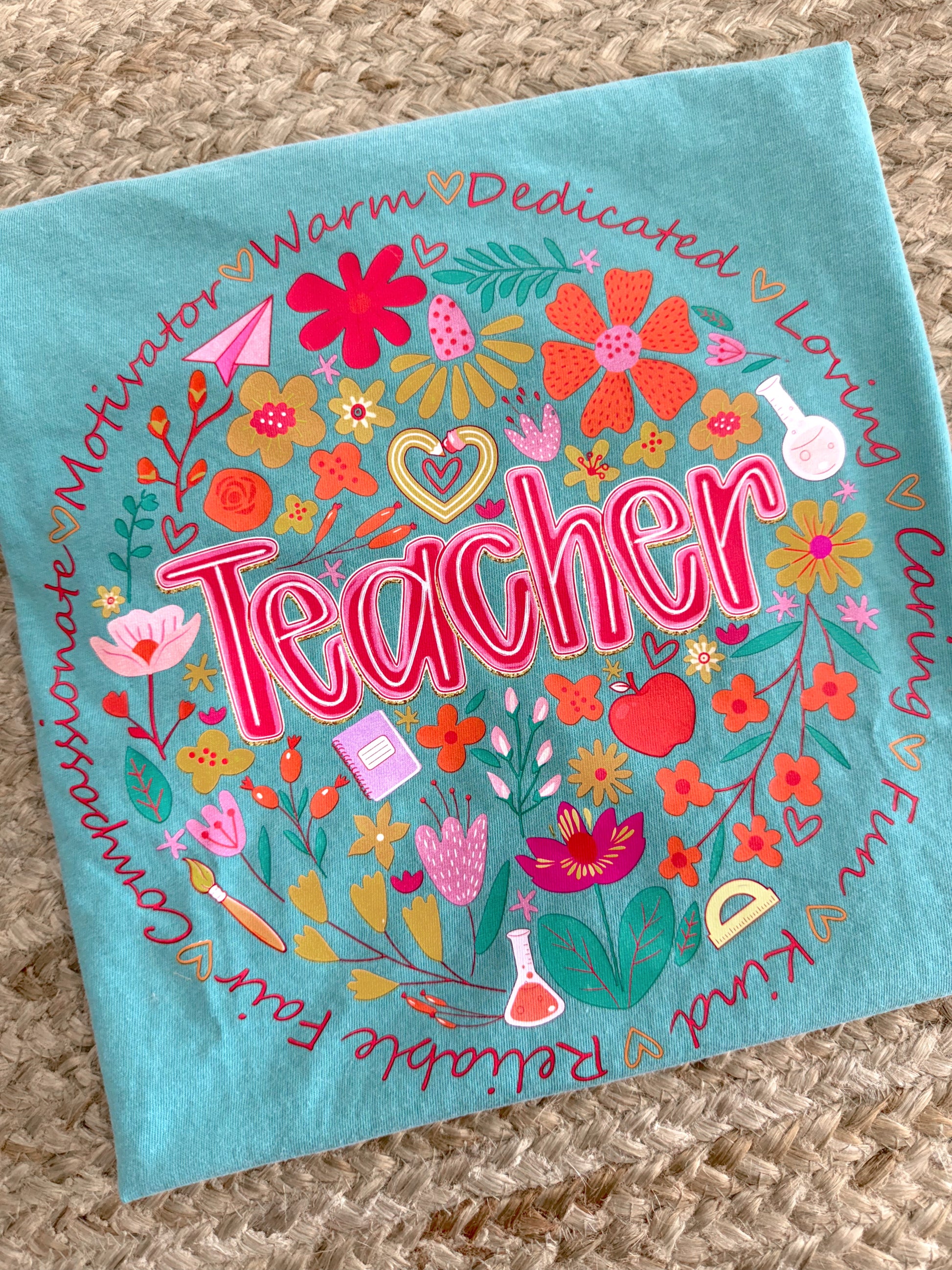 Celebrate the heart of every classroom with this beautifully designed Seafoam Comfort Colors® short sleeve tee. Featuring a soft seafoam hue and Teacher surrounded by vibrant florals, this shirt highlights the inspiring words that define educators: